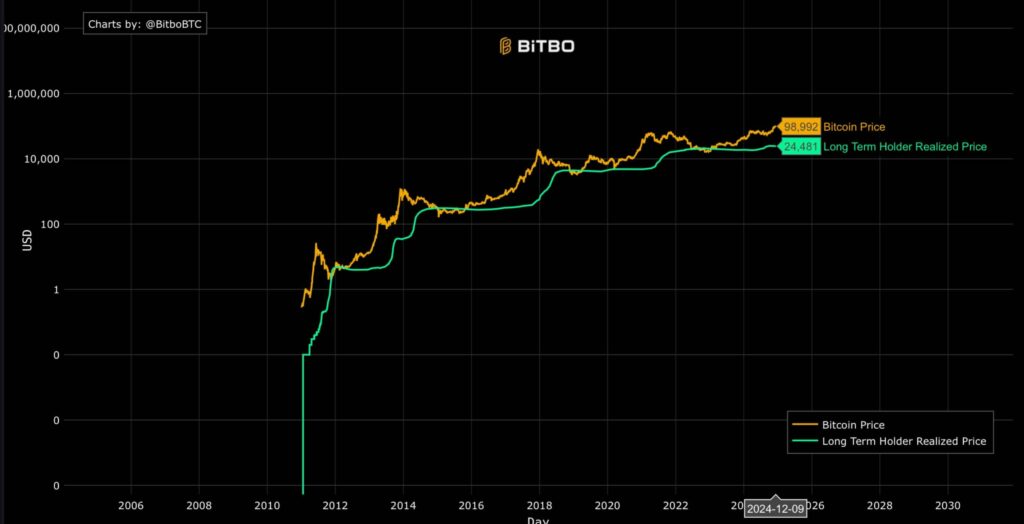 نسبت ریسک سمت فروش و حجم خالص خریداران ممکن است نشاندهنده رسیدن به سقف بازار باشند. طبق دادههای بیتبو (Bitbo)، قیمت تحقق یافته هولدرهای بلندمدت – میانگین قیمتی که توسط آنها پرداخت شده – ۲۴٬۴۸۱ دلار است که نشاندهنده حدود ۴۰۰٪ میانگین سود است.