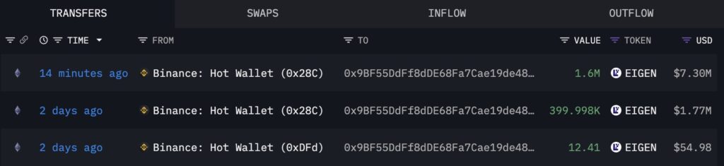 پلتفرم تحلیلی لوک آنچین (LookOnChain) اخیراً توییتی منتشر و بیان کرده این نهنگ در طول دو روز گذشته ۲ میلیون توکن آیگن لیر را از صرافی بایننس خارج کرده است. آخرین خرید او شامل ۱.۶ میلیون EIGEN (به ارزش تقریبی ۷.۲۵ میلیون دلار) بوده است.