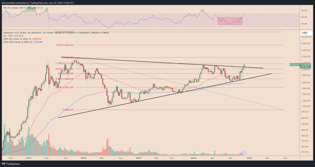 اکنون بهنظر میرسد اتریوم در حال تجربه روندی مشابه با ریپل است. در طول هفته گذشته، ETH توانست از خط روند بالایی الگوی مثلث متقارن سهساله خود عبور کند.