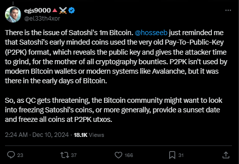 بیت کوینهای ساتوشی از فرمت P2PK استفاده میکنند که کلید عمومی را فاش میکند و به مهاجمان زمان میدهد تا آن را بشکنند. این جایزه عظیمی برای مهاجمان و هکرهای حوزه ارزهای دیجیتال است.