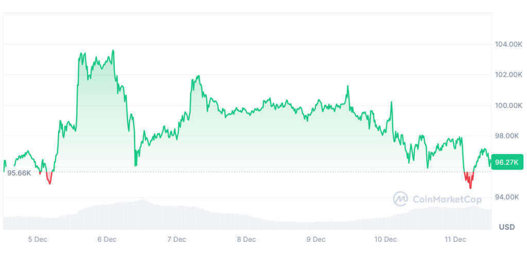 قیمت بیت کوین نیز در طول روز گذشته کاهش داشت و به ۹۴٬۲۵۳ دلار رسید. قیمت بیت کوین از ۹ دسامبر (۱۹ آذر) به زیر سطح ۱۰۰,۰۰۰ دلار کاهش یافته است. این در حالی است که قیمت BTC در تاریخ ۵ دسامبر (۱۵ آذر) برای اولین بار ۶ رقمی شده بود.