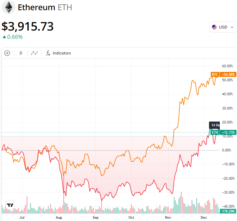این پیشبینی در حالی مطرح شده که بیت کوین در سال ۲۰۲۴ عملکرد به مراتب بهتری را نسبت به اتریوم به ثبت رسانده است. دادهها نشان میدهد که طی شش ماه گذشته، قیمت بیت کوین بیش از ۵۴٪ و قیمت اتریوم تنها ۱۲٪ افزایش یافته است. با این حال، تحلیلگران بایبیت بر این باورند که اتریوم در سال جدید میلادی این عقبماندگی را جبران خواهد کرد.