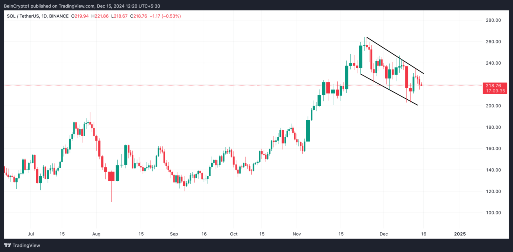 قیمت سولانا از تاریخ ۲۳ نوامبر (۳ آذر) درون یک کانال نزولی در حال حرکت است. تشکیل پشت سر هم سقفها و کفهای پایینتر، نشاندهنده تداوم فشار فروش بر یک دارایی است.