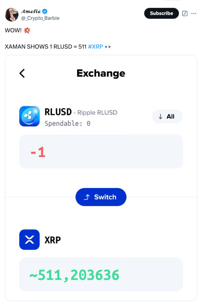 توییتی در X منتشر شده بود که نشان میداد ۱ واحد RLUSD در Xaman، کیف پول ریپل، تقریبا برابر با ارزش ۵۱۱ واحد XRP (حدوداً معادل ۱,۲۴۴ دلار) ارزشگذاری شده است.