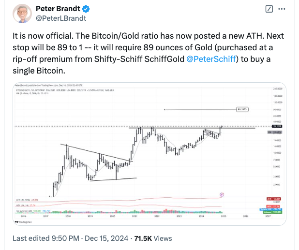 پیتر برنت (Peter Brandt)، معاملهگر باتجربه بازار، در تاریخ ۱۶ دسامبر (۲۶ آذر) توییتی منتشر و اشاره کرد که نسبت بیت کوین به طلا به ATH جدیدی دست یافته است.