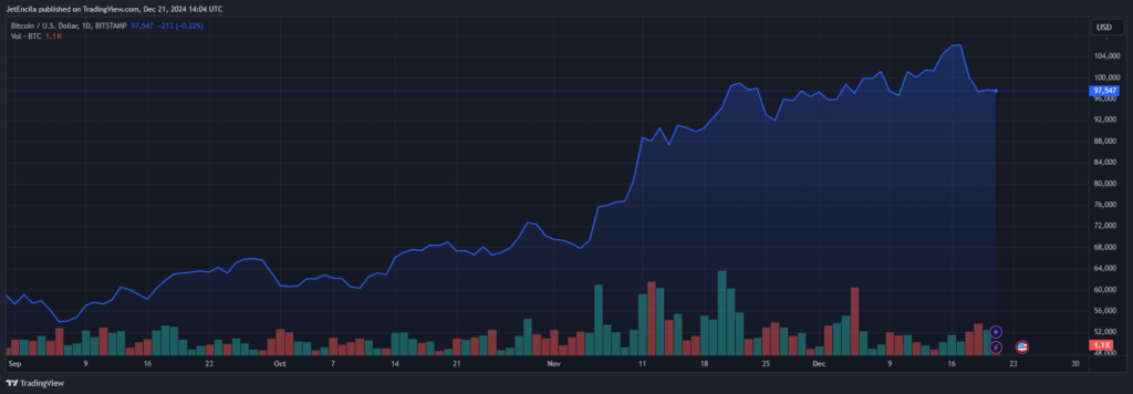 در حال حاضر، قیمت بیت کوین ۹۸،۶۵۲ دلار بوده و به طور پیوسته در حال افزایش است تا به بالاترین سطح قبلی خود در بالای ۱۰۰،۰۰۰ دلار بازگردد. برای رسیدن به بالاترین رکورد جدید، بیت کوین باید بیش از ۷٪ افزایش یابد و از بالاترین رکورد فعلی خود در بالای ۱۰۴،۰۰۰ دلار عبور کند.