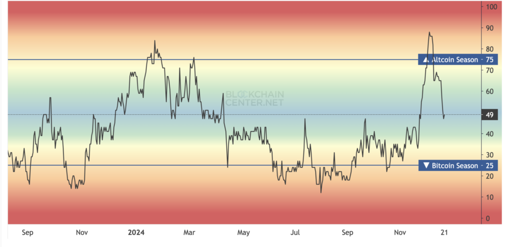 به طور معمول، مقدار شاخص بالای ۷۵ نشاندهنده شروع فصل آلتکوین است، در حالی که مقدار ۲۵ نشاندهنده دامیننس بالای بیت کوین است. با این حال، اکنون این شاخص به ۴۹ کاهش یافته است نشاندهنده یک عقبنشینی برای آلتکوینهاست و بیت کوین جایگاه قویتری در بازار به دست میآورد.