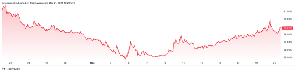 اما در زمان نگارش این مقاله، دامیننس بیت کوین به ۵۸.۸۲٪ کاهش یافته است که نشان میدهد آلتکوینها سهمی از کنترل را در دست گرفتهاند. در صورت ادامه این کاهش، قیمت بیت کوین ممکن است کاهش یابد در حالی که قیمت آلتکوینها احتمالا افزایش پیدا کند.