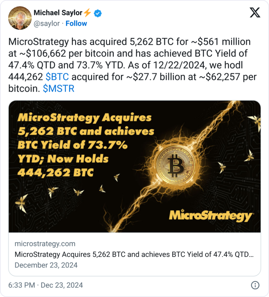 اما خرید اخیر تنها ۱۲٪ از مجموع خریدهای این شرکت در دسامبر را تشکیل میدهد و کوچکترین خرید از ژوئن و جولای ۲۰۲۴ تاکنون است؛ زمانی که تنها ۱۶۹ واحد بیت کوین خریداری شده بود.