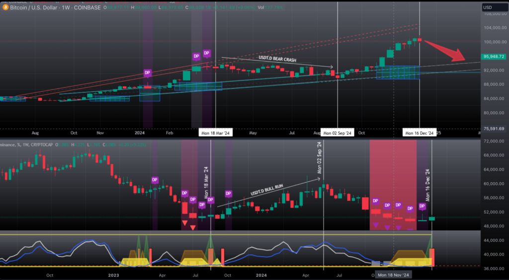به گفته فارکس مایندست (The ForexX Mindset)، یکی از مشارکتکنندگان تریدینگ ویو، قیمت بیت کوین ممکن است به دلیل همبستگی منفی آن با شاخص دامیننس تتر (USDT.D)، معیاری از سهم تتر در کل بازار رمزارزها، شاهد یک کاهش قیمت شدید باشد.