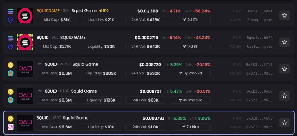 توکنهای اسکویید گیم در بلاکچین سولانا – منبع: Dexscreener