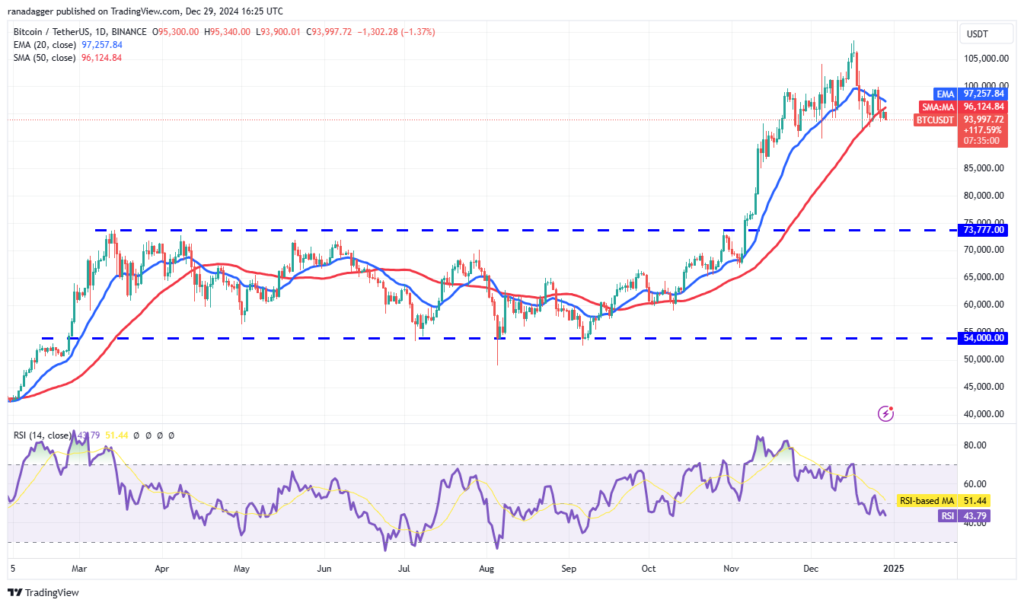 خریداران تلاش کردند در ۲۸ دسامبر (۸ آذر) قیمت را به بالای میانگین متحرک ساده ۵۰ روزه بازگردانند، اما موفق نشدند. میانگین متحرک نمایی ۲۰ روزه (۹۷۲۵۷ دلار، موج آبی رنگ) شروع به کاهش کرده است و شاخص قدرت نسبی (RSI) در محدوده منفی قرار دارد که نشان دهنده برتری فروشندگان است.
