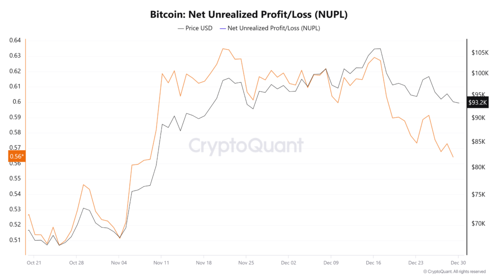 با این حال، کاهش NUPL در اوایل دسامبر، همزمان با اصلاح قیمت، نشاندهنده افزایش ترس و عدم قطعیت در بازار بود. اما در ادامه، با وجود نوسانات قیمت، NUPL در محدوده «باور/انکار» باقی ماند که نشان دهنده پایداری احساسات مثبت در بازار است.