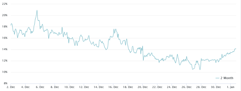در ۲۸ دسامبر (۸ دی)، پریمیوم آتی ۱ ماهه بیت کوین به طور خلاصه به سطوح خنثی نزدیک شد و به ۹.۵٪ رسید، اما به سرعت به بالای آستانه ۱۰٪ بازگشت. در حال حاضر، پریمیوم ۱۵٪ است که بالاترین میزان از ۲۰ دسامبر ۲۰۲۴ (۳۰ آذر) است و نشاندهنده ادامه اطمینان خریداران علیرغم ضعف اخیر قیمت بیت کوین است.