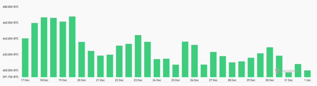 سود باز معاملات آتی بیت کوین در ۲۰ دسامبر ۲۰۲۴ (۳۰ آذر) به ۶۶۸٬۱۰۰ بیت کوین رسید، اما از آن زمان ۱۱٪ از این موقعیتها بسته شده است. سطح فعلی ۵۹۵٬۷۰۰ بیت کوین پایینترین سطح از ۴ نوامبر (۱۴ آبان) است؛ اگرچه این لزوماً به معنای شکست خریداران نیست.