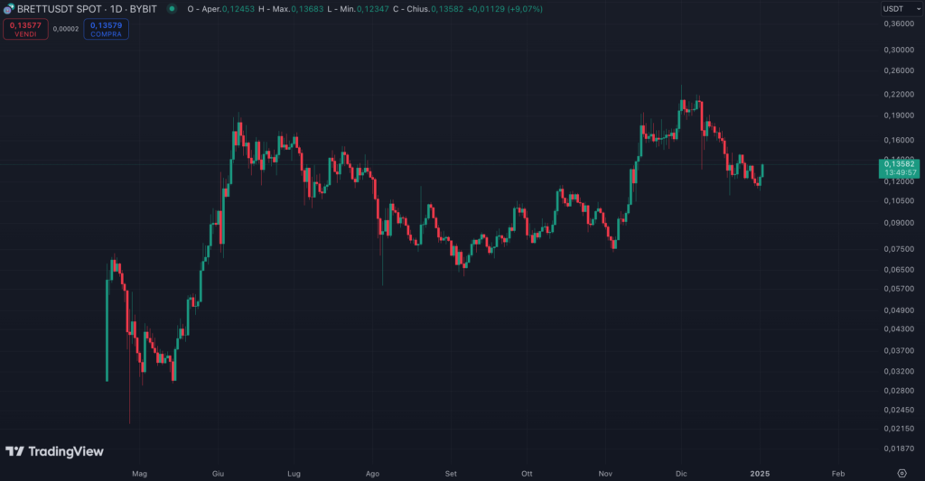 نمودار قیمت روزانه برت (BRETT/USDT) – منبع: TradingView