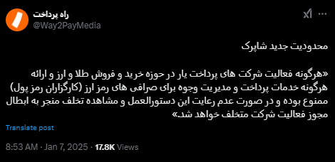 توییت راه پرداخت در رابطه با منع پرداختیارها از ارائه خدمات به صرافیهای رمزارزی