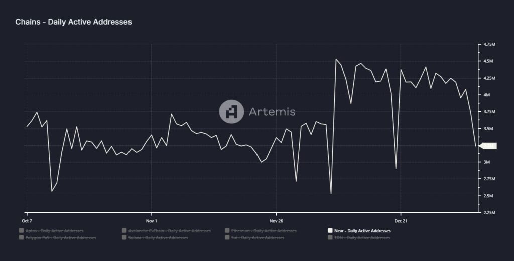 تعداد آدرسهای فعال در شبکه نیر بهشدت کاهش یافته، که نشاندهنده کاهش علاقه سرمایهگذاران است؛ این موضوع اغلب تاثیری منفی بر قیمت میگذارد. بر اساس دادههای پلتفرم آرتمیس (Artemis)، تعداد آدرسهای فعال از ۴.۲ میلیون در اول ژانویه، کاهش یافته و حال به ۳.۲ میلیون رسیده است.
