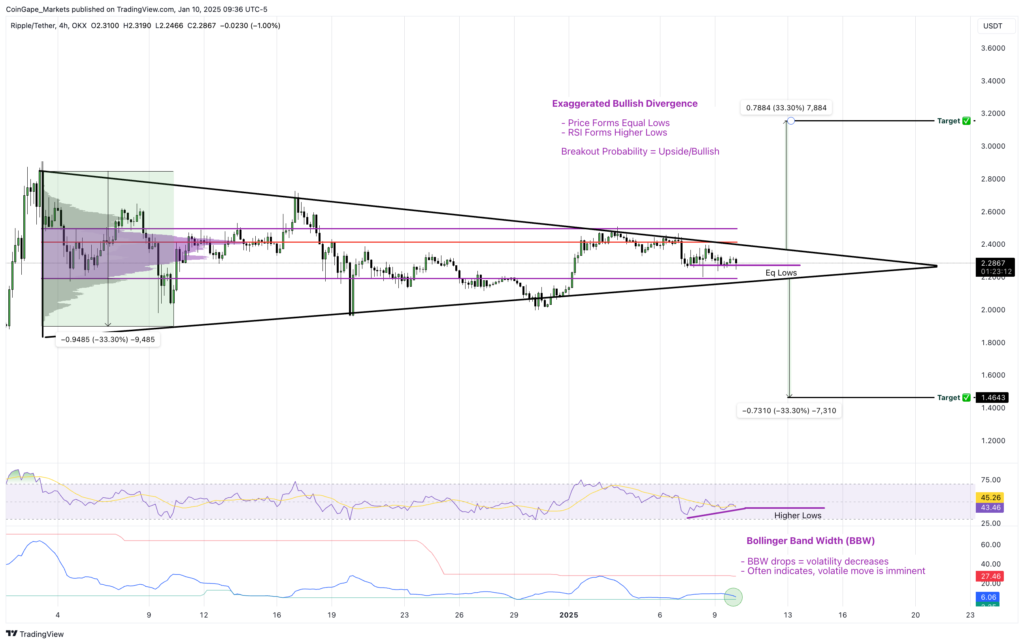 هنگامی که نوسانات کاهش مییابد، احتمال اهرم بالا وجود دارد. سرمایهگذاران اغلب موقعیتهای باز را با انتظار سودهای کلان در زمان شکست قیمت حفظ میکنند. همانطور که تحلیلگری به نام مکس پین (MAXPAIN) اشاره کرده است، ریپل در تایم فریم ۴ ساعته در یک الگوی مثلث متقارن فشرده شده است و منتظر شکست صعودی است.