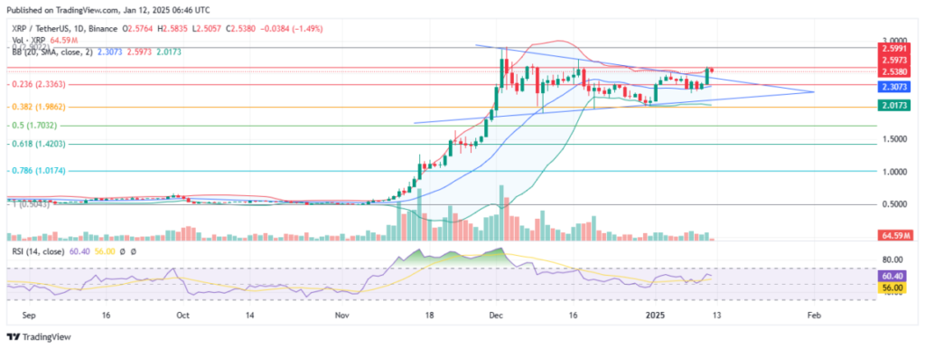 باندهای بولینگر (Bolinger Bands) نشاندهنده پتانسیل صعودی قابلتوجهی هستند و قیمت ریپل نزدیک به باند بالایی حرکت میکند. علاوه بر این، شاخص قدرت نسبی (RSI) در سطح ۶۰ نشاندهنده فضای کافی برای روند صعودی و حمایت از شکست صعودی فعلی است.