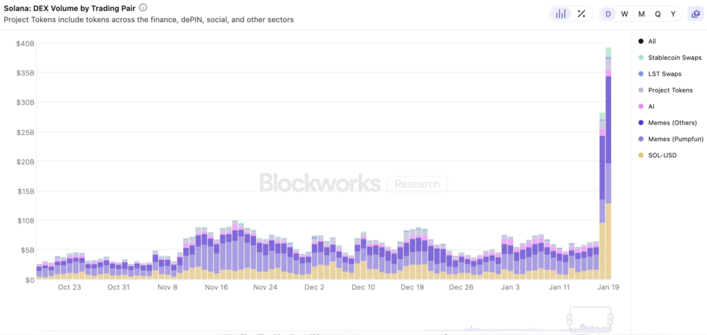 در ۱۸ ژانویه (۲۹ دی)، حجم کل تراکنشهای شبکه DEX سولانا به ۲۸.۲ میلیارد دلار رسید که رکوردی جدید بود. یک روز بعد، در ۱۹ ژانویه (۳۰ دی)، این رقم به ۳۹.۲ میلیارد دلار افزایش یافت و دوباره رکورد قبلی را بهطور چشمگیری شکست.