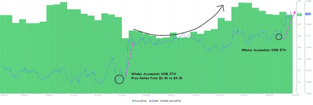 طی ۲ هفته گذشته، گروههای متعددی از آدرسهای اتریوم بیش از ۳۳۰,۰۰۰ ETH به دارایی خود اضافه کردهاند. آیا این موضوع میتواند نشانهای از رسیدن قیمت اتریوم به ۵,۰۰۰ دلار باشد؟