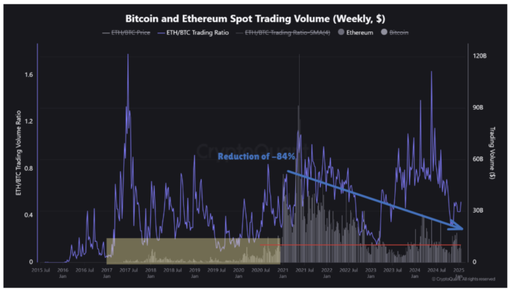 در طرف دیگر، پرسیوال (Percival)، تحلیلگر آنچین کریپتوکوانت (CryptoQuant)، به تفاوت کلیدی میان حجم معاملات بازار اسپات در سالهای ۲۰۲۱, ۲۰۲۴ و ۲۰۲۵ اشاره کرد. او توضیح داد حجم معاملات اتریوم از ۵۲ میلیارد دلار ژانویه ۲۰۲۱، در سال ۲۰۲۵ به ۸ میلیارد دلار کاهش یافته است؛ که خبر از افت ۸۴٪ میدهد. او افزود: