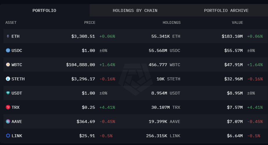 بر اساس دادههای آرکهام اینتلیجنس (Arkham Intelligence)، کیف پول متعلق به WLFI تاکنون ۵۵,۳۴۱ توکن ETH (به ارزش بیش از ۱۸۳ میلیون دلار) انباشت کرده و پس از USDC، بزرگترین دارایی موجود در این کیف پول است.