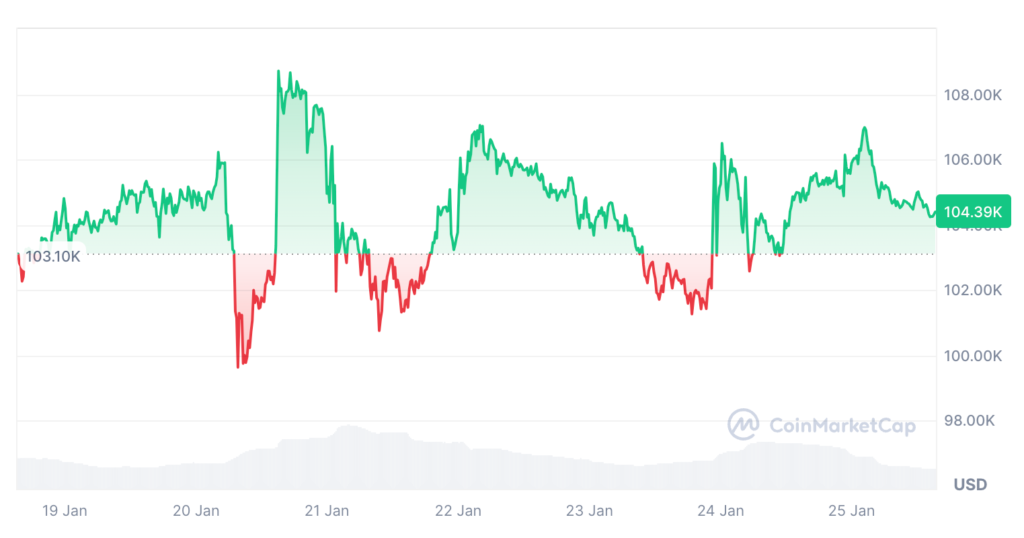 در طول ماه ژانویه، قیمت بیت کوین در حوالی سطح روانی ۱۰۰,۰۰۰ دلار در حال نوسان بوده و چندین بار به زیر این سطح افت کرده است. با این حال، بیت کوین در تاریخ ۲۰ ژانویه (۱ بهمن) – و درست پیش از مراسم تحلیف ترامپ – به رکورد جدید ۱۰۹,۰۰۰ دلار رسید.