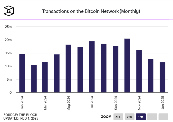تراکنشهای روزانه در روزهای منتهی به مراسم تحلیف دوم دونالد ترامپ، افزایش قابل توجهی داشتند، اما پس از آن دوباره کاهش یافتند. میانگین متحرک هفتروزه تراکنشهای روزانه نیز به کمترین سطح خود از فوریه ۲۰۲۴ رسیده است.