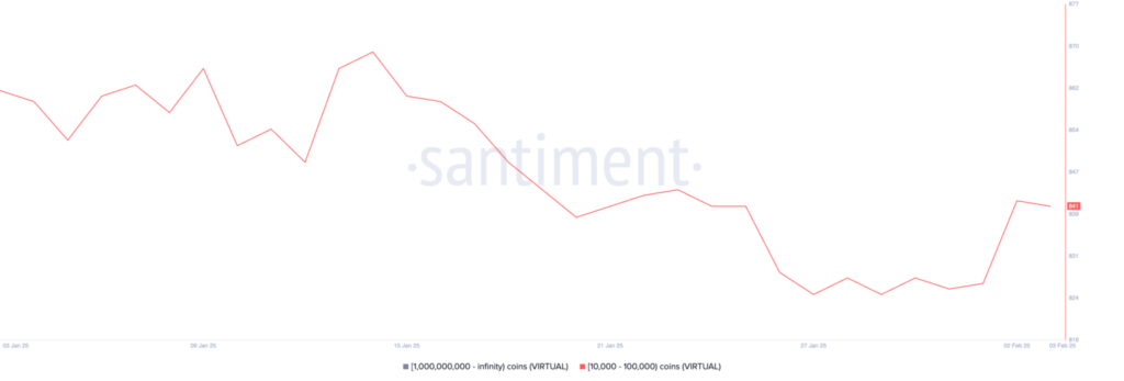 تعداد نهنگهایی که بین ۱۰,۰۰۰ تا ۱۰۰,۰۰۰ توکن VIRTUAL نگهداری میکنند، از ۸۳۱ (در تاریخ ۲۵ ژانویه) کاهش یافته و پس از ۲ روز به ۸۲۵ رسید.