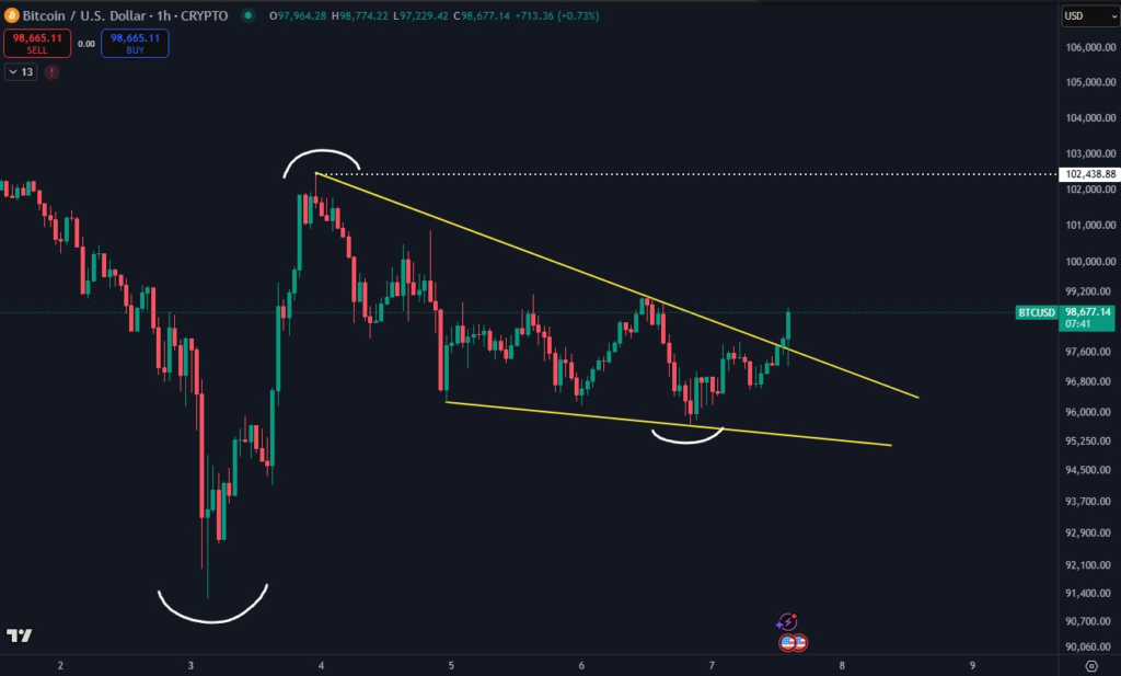 دان کریپتو تریدز (Daan Crypto Trades)، معاملهگر مشهور در پستی در X، همزمان با انتشار نموداری که نشان میداد بیت کوین از یک الگوی کنج نزولی (falling wedge) در تایمفریم ساعتی خارج شده، نوشت: