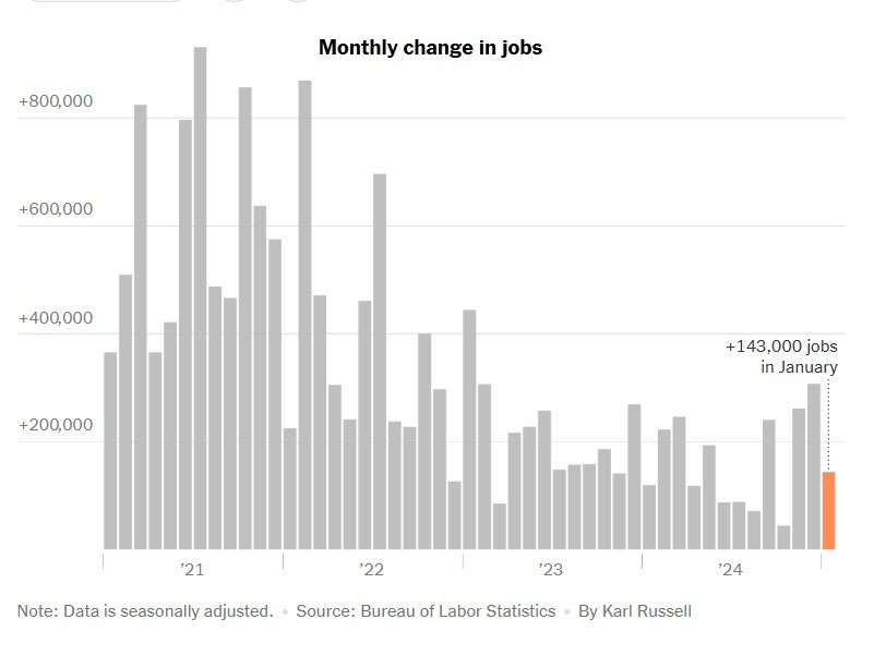 به گزارش میهن بلاکچین، در ۷ فوریه (۱۹ بهمن)، مقامات آمریکایی اعلام کردند که اقتصاد این کشور در ماه ژانویه ۱۴۳٬۰۰۰ شغل جدید ایجاد کرده است که کمی کمتر از پیشبینیها بود.