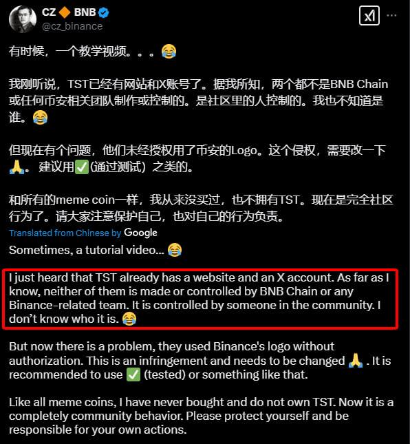CZ در پست خود نهتنها ارتباط خود و تیم بایننس را با TST رد کرد، بلکه به تیم پشت این توکن هشدار داد که نباید از برند بایننس سوءاستفاده کنند و جامعه را گمراه کنند. او نوشت:
