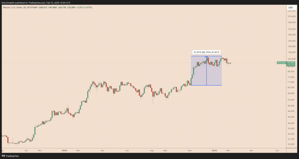 بیت کوین (BTC) از زمان ثبت رکورد بالای خود در حدود ۱۰۹,۳۵۵ دلار در ۲۰ ژانویه (۱ بهمن)، بیش از ۱۰٪ کاهش یافته است. این سقف همزمان با به قدرت رسیدن دونالد ترامپ بود که نشاندهنده ۶۰٪ سود از زمان پیروزی او در انتخابات نوامبر است.