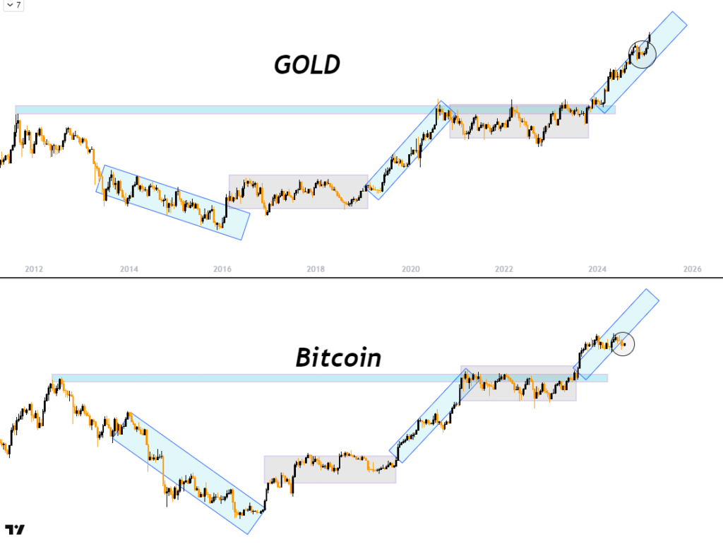 تا زمانی که طلا به روند خود ادامه دهد، بیت کوین تقریباً همیشه یک شکست صعودی مشابه (بزرگتر) را در عرض ۳-۶ ماه مشاهده میکند. امیدوارم این بار در بخش کوتاه این بازه زمانی رخ دهد.