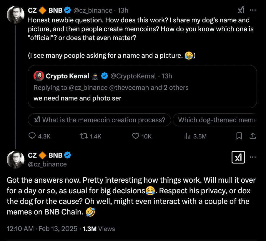 سیزی، بنیانگذار بایننس نیز در گفتوگویی در پلتفرم X بهطور تصادفی باعث گمانهزنی درباره یک میم کوین جدید شد. او در این گفتوگو اشاره کرد که یک سگ از نژاد بلژین مالینوی دارد که باعث شد کاربران از او نام و عکس سگش را بخواهند که احتمالاً به قصد ایجاد میم کوینی مربوط به آن است!