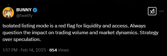 حالت لیستینگ ایزوله یک پرچم قرمز برای نقدینگی و دسترسی است. همیشه تاثیر آن بر حجم معاملات و پویایی بازار را زیر سوال ببرید. استراتژی بر سفتهبازی اولویت دارد.