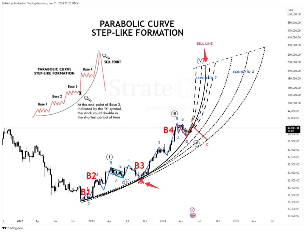 نمودار لاگن، Base 1، Base 2، Base 3 و Base 4 را برجسته میکند. این نقاط یک ساختار انباشت پلکانی هستند که از فرآیند کشف قیمت منظم قبل از صعود پارابولیک بیت کوین حمایت میکند.