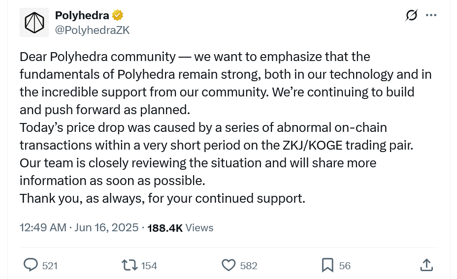 پروژه Polyhedra که بر ایجاد قابلیتهای بینزنجیرهای با استفاده از اثباتهای دانش صفر (Zero-Knowledge Proofs) تمرکز دارد، اعلام کرد در حال «بررسی دقیق وضعیت» است و در آینده اطلاعات بیشتری ارائه خواهد داد. این پروژه اطمینان داده است که «بنیادهای شبکه همچنان دستنخورده باقی ماندهاند».