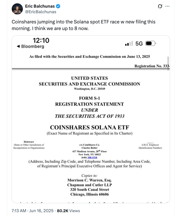 همزمان با این درخواست، شرکت کوینشرز (CoinShares) نیز امروز درخواست رسمی خودش را برای راهاندازی ETF سولانا به کمیسیون بورس آمریکا ارائه کرد.