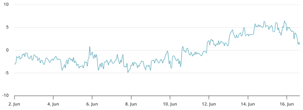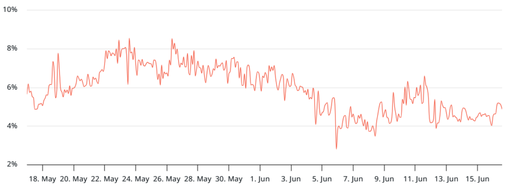روز دوشنبه، پرمیوم قراردادهای آتی بیت کوین به ۵٪ رسید که معادل پایه بازارهای خنثی است. این قراردادهای ماهانه معمولاً با پرمیومی بین ۵٪ تا ۱۰٪ معامله میشوند تا دوره تسویه طولانیتر را جبران کنند. هرچند این رقم کمتر از سطح ۸٪ در اواخر ماه می (اوایل خرداد) بود، اما هنگام تست دوباره سطح ۱۰۱٬۰۰۰ دلار در ۵ ژوئن (۱۵ خرداد)، واکنش خاصی از بازار مشاهده نشد که نشاندهنده مقاومت بازار است.