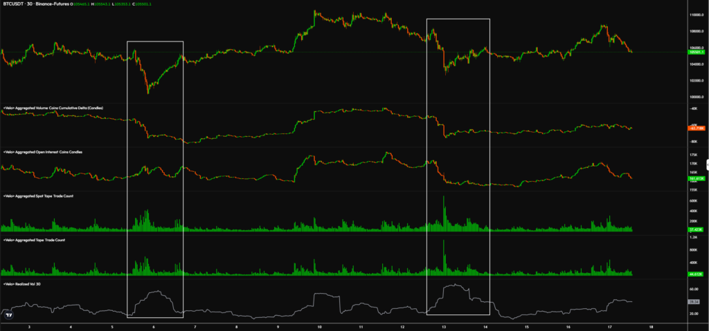 تا اینجای کار، کاهش قیمت حدود ۳٪ بوده و بازار هنوز دچار وحشت نشده، هرچند در تایمفریمهای پایینتر، تمایل به هجکردن کاملاً مشهود است. اصلاحات قبلی حدود ۵٪ بودند، اما با فشار فروش در بازار اسپات، افزایش نوسان و رشد حجم فروش همراه بودند.