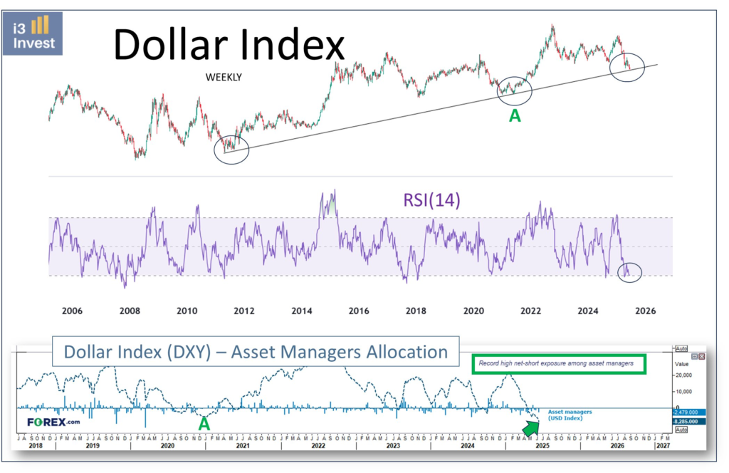 شرکتهای مدیریت دارایی به شدت در موقعیت فروش روی دلار قرار دارند. آخرین باری که موقعیتها تا این حد نزولی بود، DXY یک رالی چشمگیر را تجربه کرد.