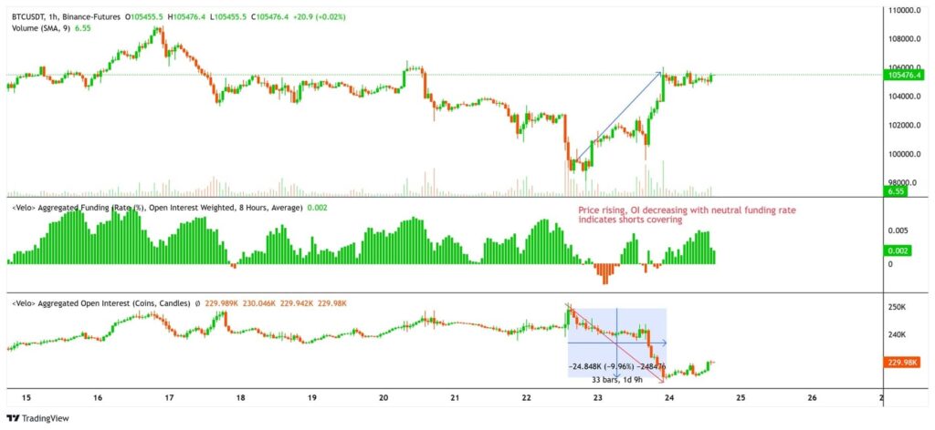 بیت کوین پس از تشکیل یک کف قیمتی در حدود ۹۸،۳۰۰ دلار، به ۱۰۵،۰۰۰ دلار رسید که افزایش قابل توجه ۶.۷٪ را نشان میدهد. با این حال، این افزایش با ۱۰٪ کاهش در قراردادهای باز (OI) همراه بود که نشان میدهد این افزایش در درجه اول ناشی از پوشش پوزیشنهای شورت بهجای ایجاد پوزیشنهای صعودی جدید بوده است.