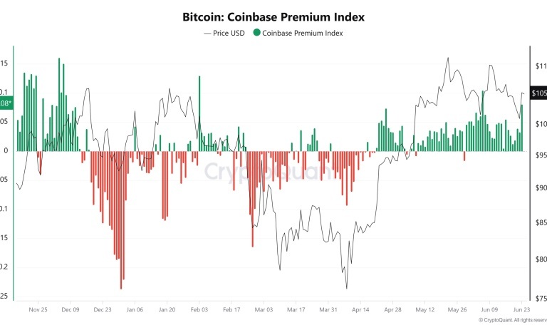 شاخص پریمیوم بیتکوین کوینبیس روز دوشنبه به دومین رکورد بالای خود رسید که نشاندهنده پریمیوم قیمت بیتکوینِ موجود در کوینبیس در مقابل بایننس است. این شاخص در بیشتر ماه ژوئن سبز باقی مانده است که نشاندهنده فشار خرید پایدار از سوی سرمایهگذاران آمریکایی است. این موضوع با جریانهای مثبت سرمایه در ETFهای اسپات در بیشتر روزهای این ماه همسو است، زیرا یک مطالعه تحقیقاتی ضریب ۰.۲۷ را نشان داد که جریانهای ورودی ETF روز قبل را به افزایش قیمت مرتبط میکند و نشاندهنده خوشبینی بازار است.
