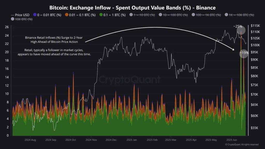 این جریانهای ورودی نشاندهنده رفتار پیشگیرانه به جای انباشت غیرفعال هستند. اقدام به واریز بیتکوین در بایننس معمولاً نشاندهنده قصد معامله است، نه نگهداشتن آن. در حالی که شرکتکنندگان خردهفروشی اغلب بهعنوان فعالان بازار دیده میشوند که دیرتر عکسالعمل نشان میدهند، این بار ممکن است جلوتر بوده باشند.