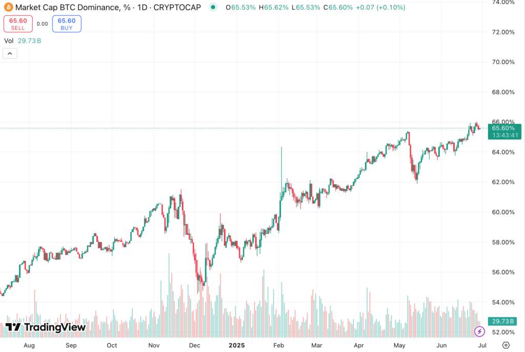 رکت کپیتال (Rekt Capital)، تحلیلگر شناختهشده، در تاریخ ۲۷ ژوئن (۶ تیر) توییتی منتشر کرد و گفت که دامیننس بیت کوین بهطور پیوسته در حال افزایش است و ممکن است به ۷۴٪ برسد. او اشاره کرد که پس از افت قیمت بیت کوین در اوایل هفته گذشته، سطح دامیننس ۶۴٪ با موفقیت دوباره آزمایش شده است.