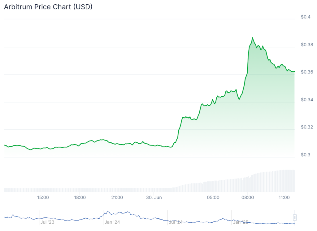 قیمت ARB از حدود ۰.۳۱ دلار در زمان انتشار پست رابینهود در X افزایش یافت و هشت ساعت بعد، به بالاترین سطح روزانه خود در ۰.۳۸۶ دلار رسید.