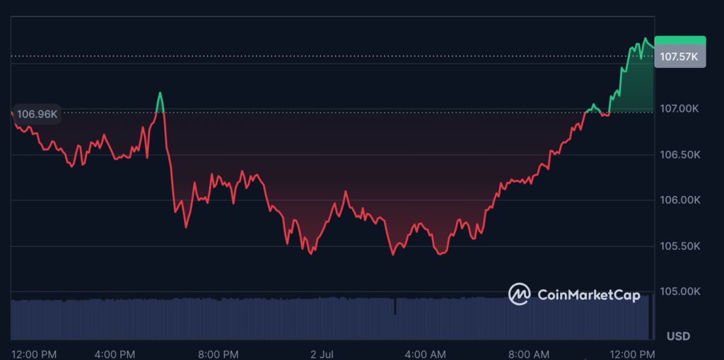 در زمان نگارش این مطلب، قیمت بیتکوین معادل ۱۰۷,۶۵۸ دلار است و حجم معاملات روزانهی آن به حدود ۴۸.۱۲ میلیارد دلار رسیده است.